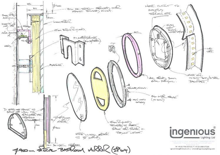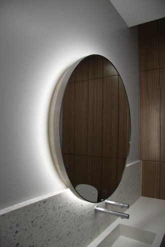 Bespoke Circular Halo effect illuminated Mirrors Manufactured from mirror polished 316 St-steel. 500mm & 900mm Diameter versions with etched logos, demist function, special backplates to span splashbacks.