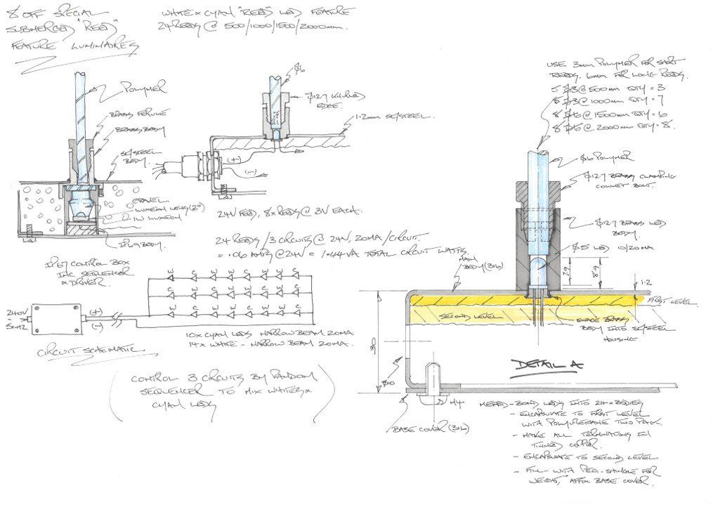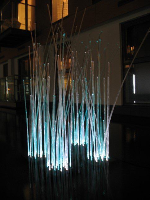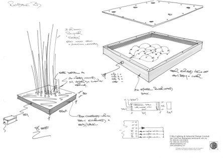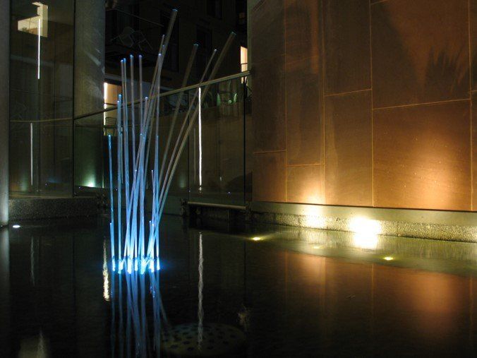 Submerged Reed effect pond feature lighting element. Square interconnecting submerged bodies to created multiple “beds” of reeds. White & Cyan leds with in-built random sequencer and fountain heads on selected bodies.