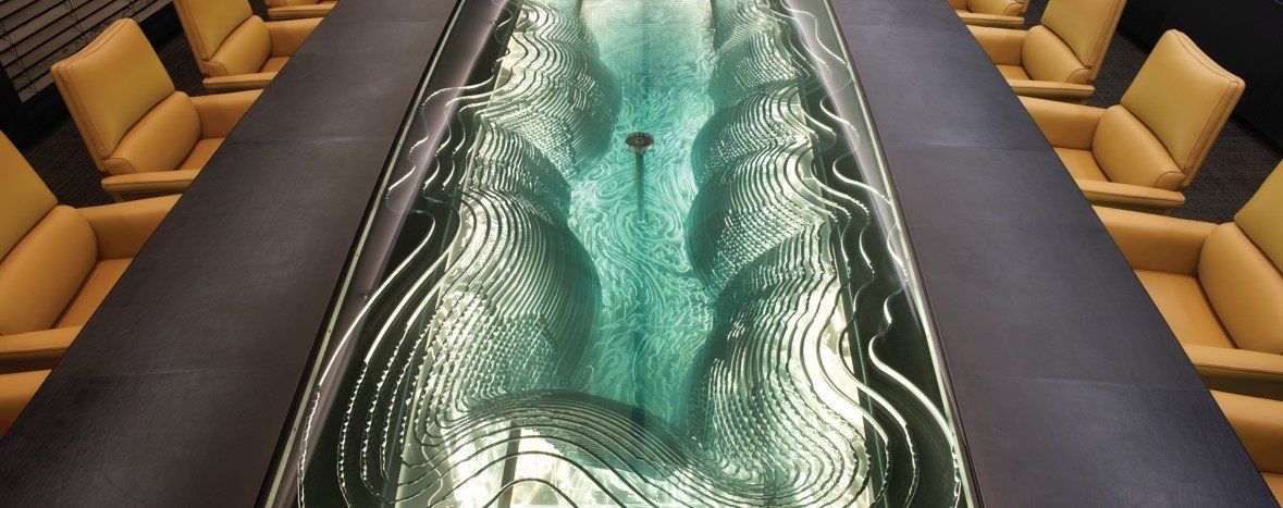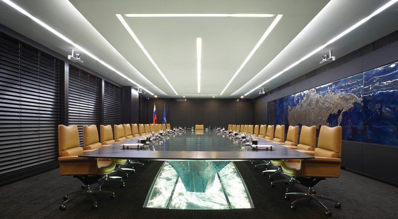 Moscow - Board room table commission, Glass/Timber/Leather, built on illuminated glass floor, multiple level indirect ceiling construction.